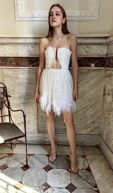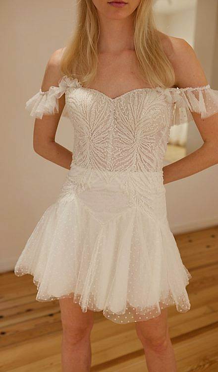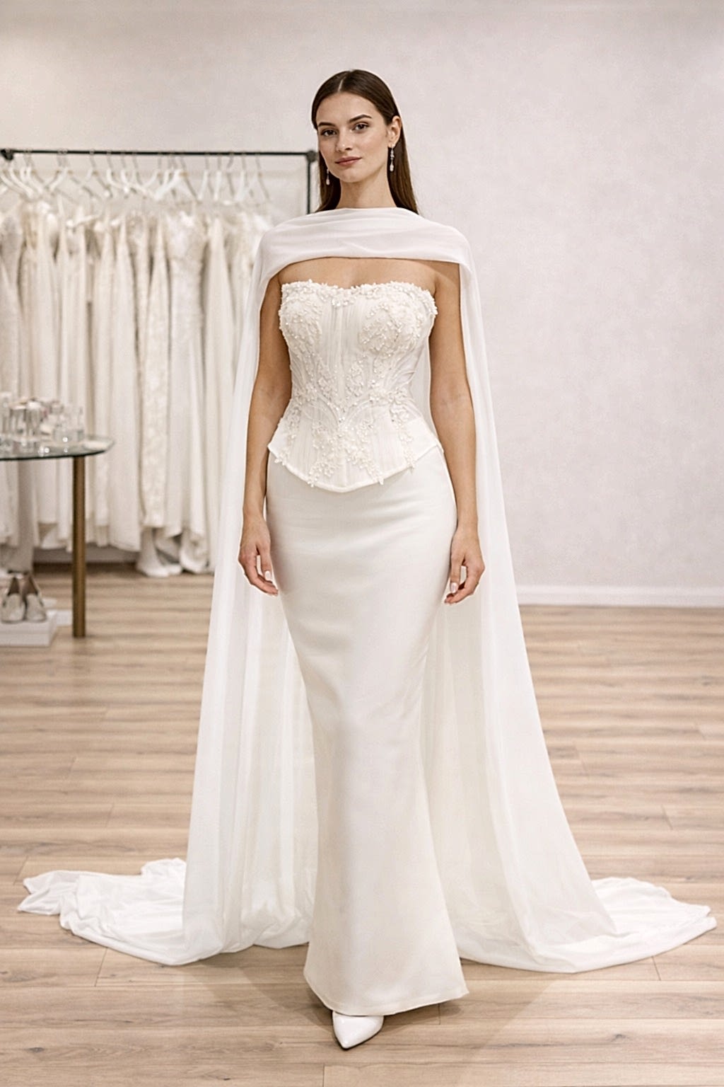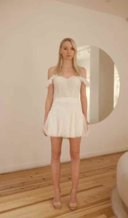 2 parçadan oluşan korseli bedeni çiçek ve dantel işlemeli beyaz elbise